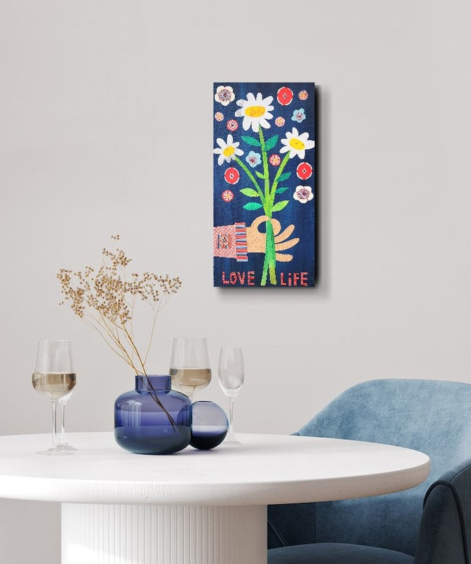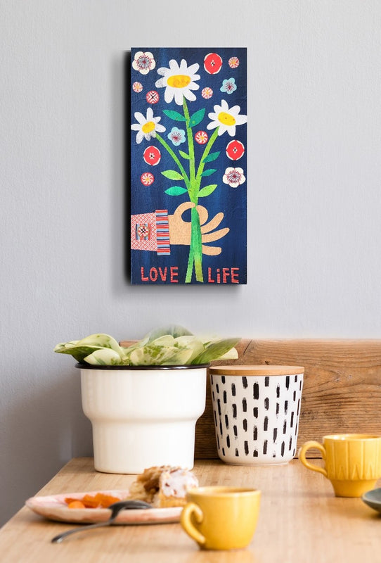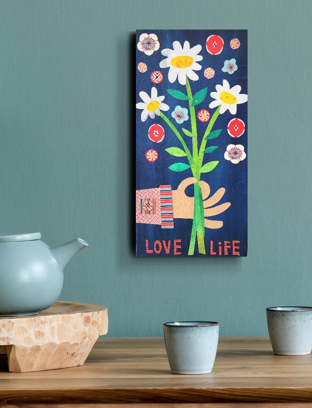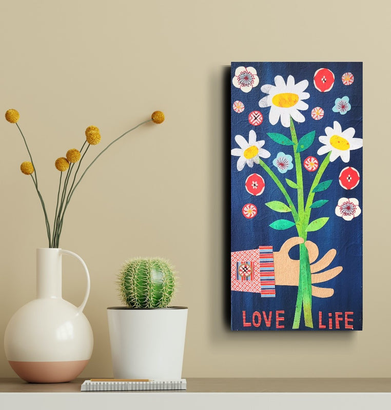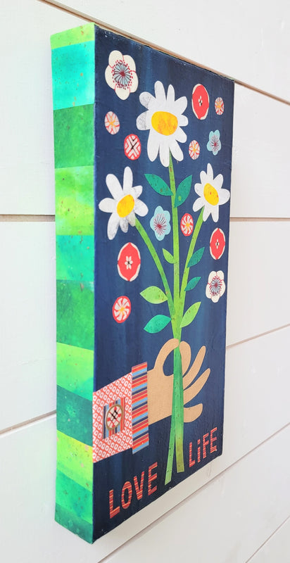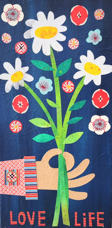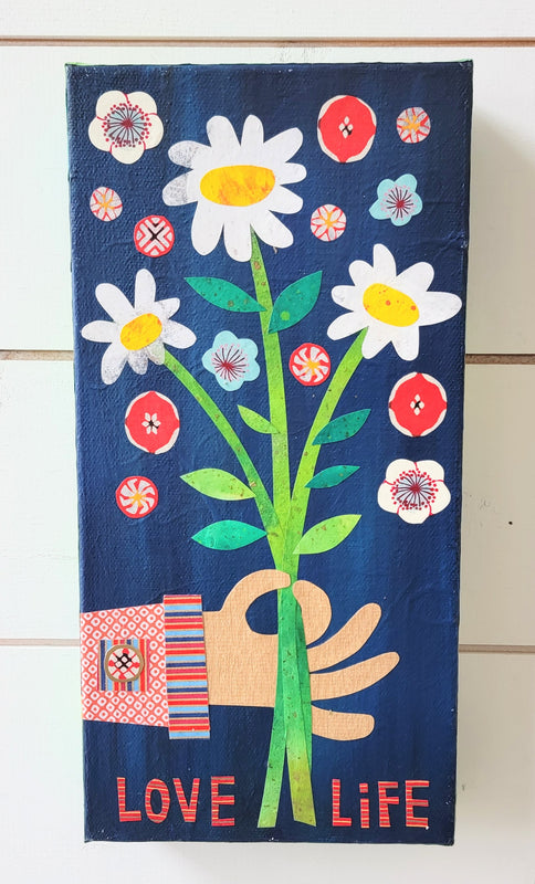 • Is it, "LOVE life" or " Love LIFE? You decide! Inspired by the beauty bouquets, found at Pike Place Market in the historic district of Downtown Seattle, I created this bursty bouquet with hand cut and hand painted decorative papers along with hand silkscreened papers from Japan. It measures 6x12" with a 1.5" decorative edge.