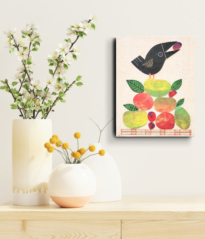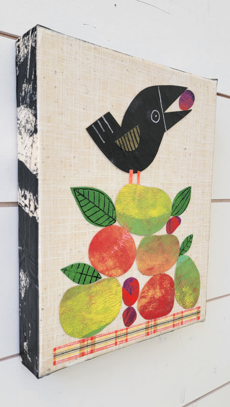 • Inspired by vintage and Japanese illustration, I created this cutie crow with hand cut and hand painted decorative papers. It measures 8x10" with a 1.5" decorative edge.