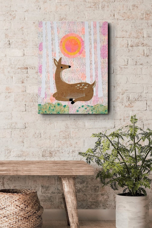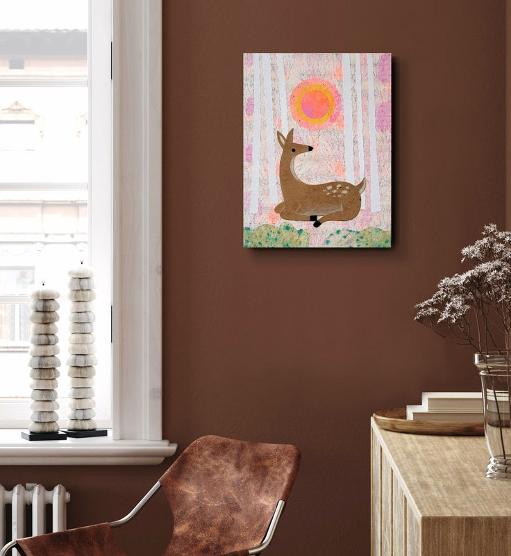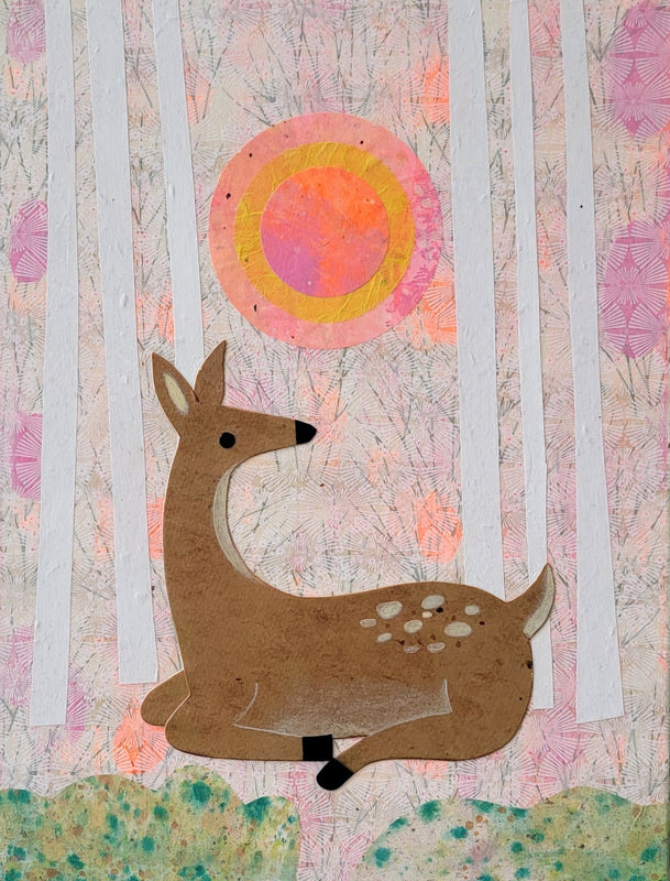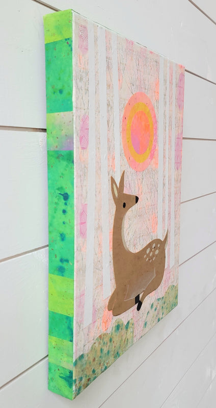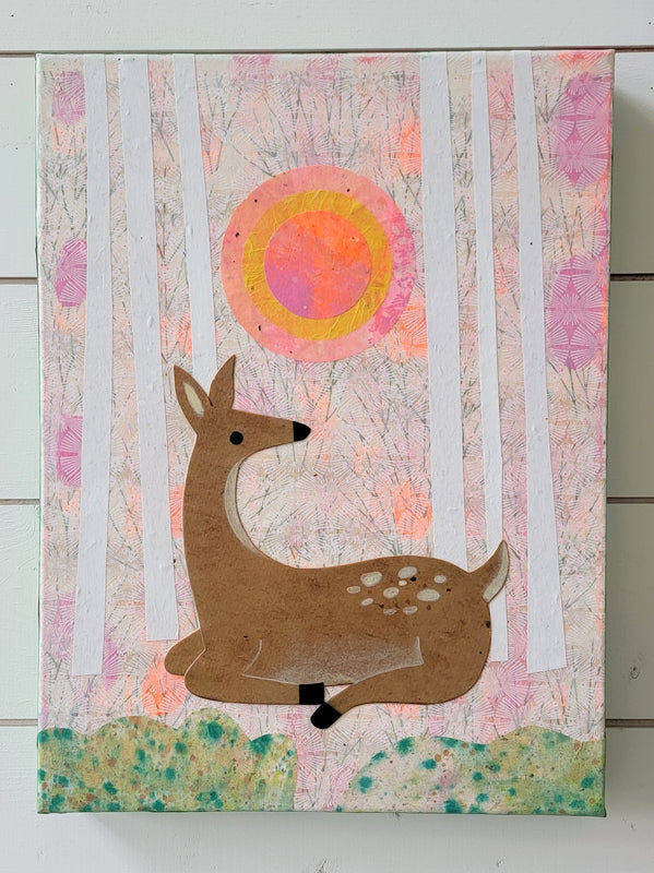 • Inspired by vintage children's book illustration, I created this serene scene with hand cut and hand painted decorative papers. I assembled the images to an 11x14" stretched canvas with a 1.5" decorative edge.